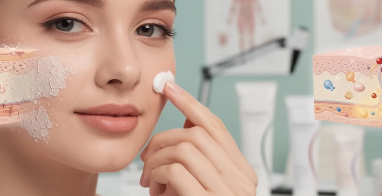 La présence de squames fines à la surface des dartres pose une question délicate : comment lisser la peau sans l’agresser davantage ? Les agents kératolytiques, tels que l’acide salicylique et l’urée, peuvent être utiles, mais uniquement à faible concentration et dans des formules spécifiquement conçues pour le visage. À des doses de 2 à 5 %, l’urée exerce une action kératorégulatrice et hydratante, en rompant partiellement les ponts hydrogène entre les cornéocytes tout en augmentant la capacité de rétention d’eau de la couche cornée.