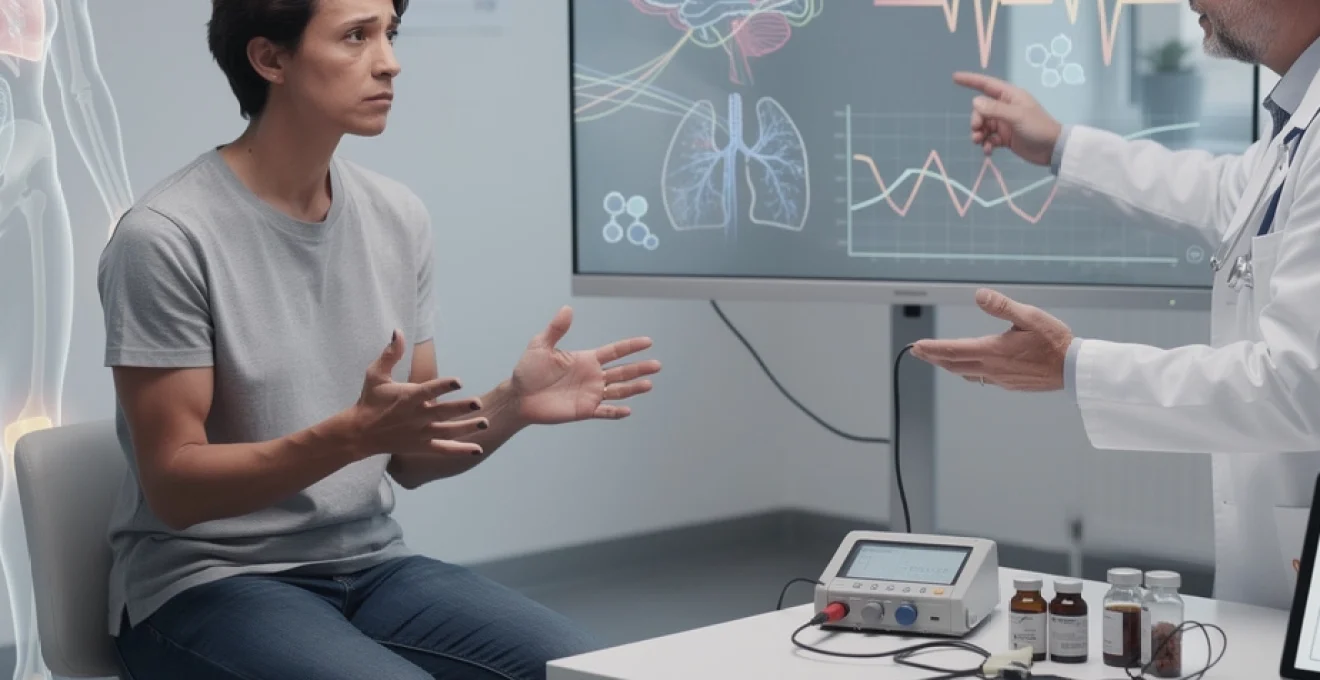 Parmi les diagnostics à évoquer en priorité figurent les troubles métaboliques (hypocalcémie vraie, hypomagnésémie sévère, hyperthyroïdie), les maladies neurologiques (épilepsie, neuropathies périphériques, sclérose en plaques), les pathologies cardiovasculaires (cardiopathies ischémiques, troubles du rythme, embolie pulmonaire) et certaines maladies respiratoires (asthme, BPCO). Un bilan de base comprenant examen clinique complet, ECG, prise de sang (ionogramme, calcémie, magnésémie, TSH, numération) permet le plus souvent d’éliminer ces causes.